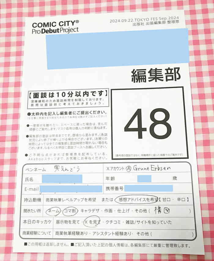 どこの編集部に持ち込むかは、事前にCOMIC CITY 出張編集部のサイトを確認、その中の各編集部のコメントを打ち出しして😂、二次創作でも歓迎っぽいところをチェックしました。