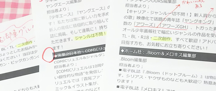 どこの編集部に持ち込むかは、事前にCOMIC CITY 出張編集部のサイトを確認、その中の各編集部のコメントを打ち出しして😂、二次創作でも歓迎っぽいところをチェックしました。